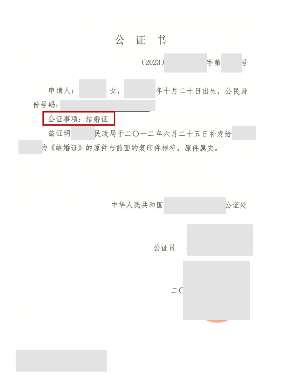 结婚证公证是公证处根据申请人申请,对其持有的国内民政部门颁发的结婚证(或涉外婚姻登记证明)的真实性、合法性及婚姻关系有效性进行核查后,出具公证书的法律行为。该公证书是出国办理配偶团聚移民、境外配偶签证、跨国财产登记、离婚诉讼等事务的核心材料,需配合外交部认证(海牙认证或双认证)使用,方可被国外移民局、使领馆、法院等官方机构认可。